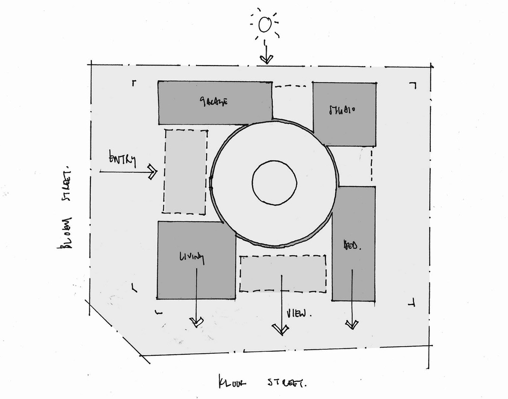 The brief for this house in Riebeeck Kasteel, in addition to a tight budget, called specifically for a circular pool and a curved wall. To avoid the contrived nature of a curved wall for the sake of it, we made it the main driver of the design - a central circular courtyard garden with a bullseye pool in its centre.